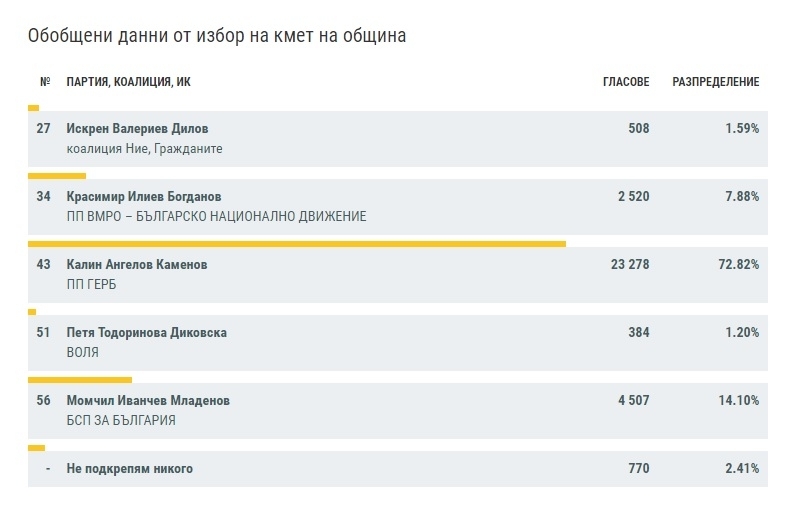 Гласовете за втория в списъка Момчил Младенов, подкрепен от БСП, са едва 4 507. В процентно съотношение това са 14.10 на сто. Кандидатът на ВМРО Красимир Богданов пък има 2 520 гласа, което е 7.88%.