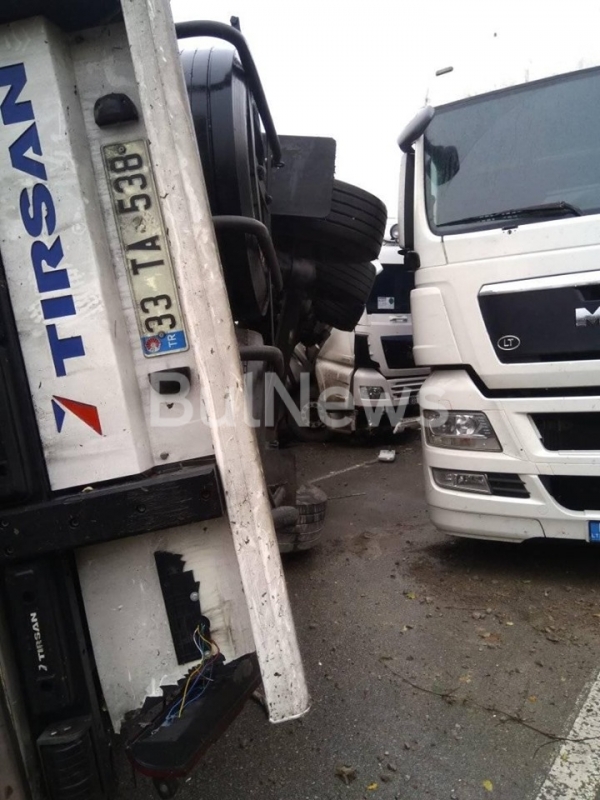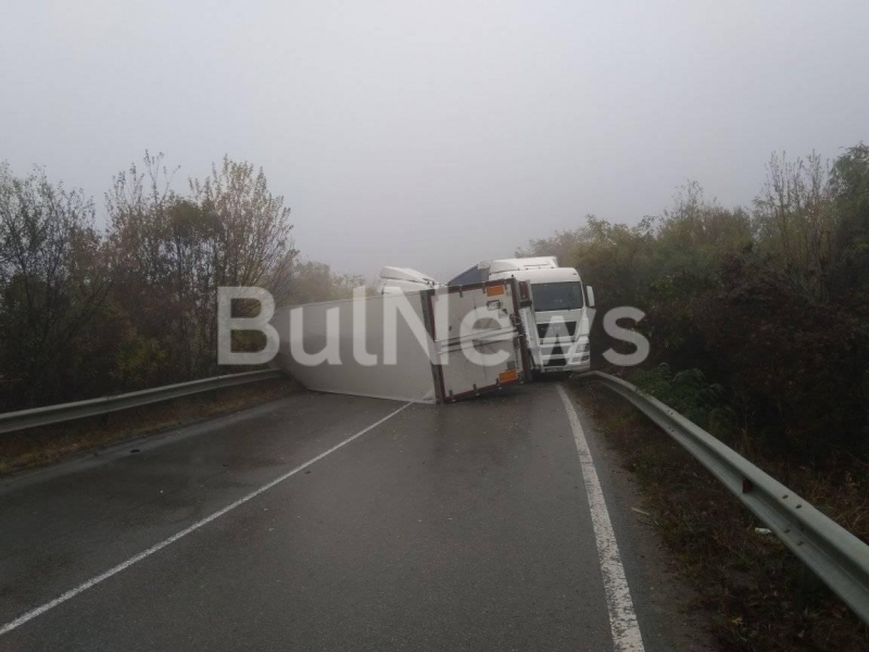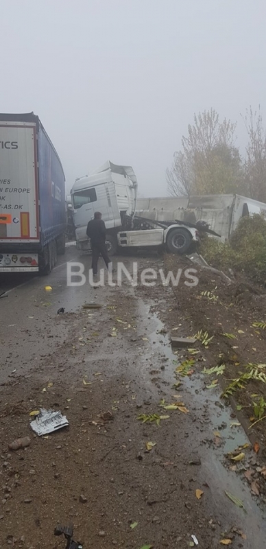 Инцидентът е станал преди минути в района на село Долна Вереница. Два тежкотоварни камиона се ударили при разминаване, като единият от тях се завъртял на пътното платно. В него се ударил трети ТИР, чиито шофьор не успял да реагира навреме и да спре.