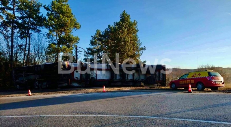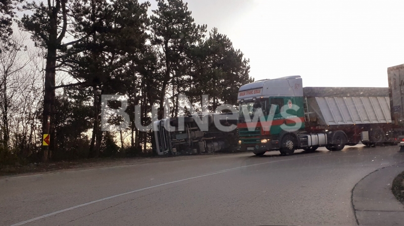 При инцидента няма пострадали хора. Обърнатият камион е в полето край пътя и не пречи на трафика в първия работен ден.