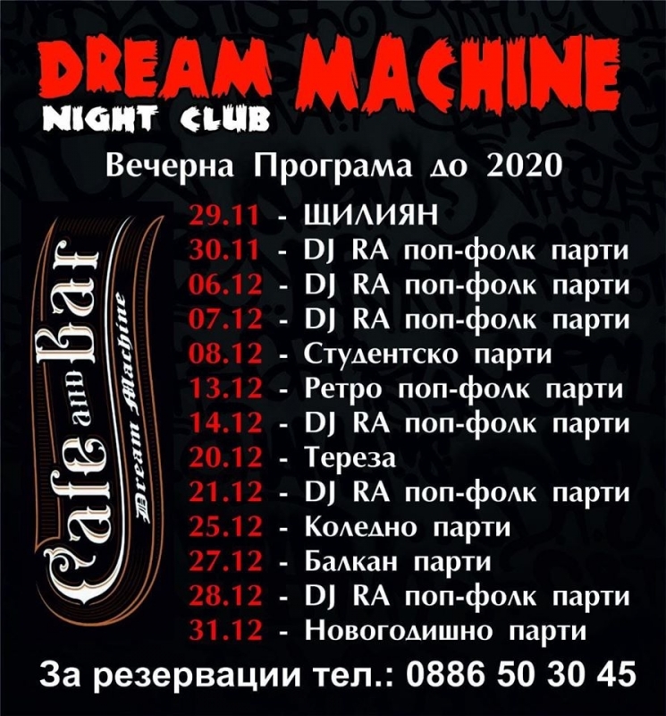 Dream Machine работи всеки ден, като през деня функционира като кафе и бар, а всяка вечер - Night Club. Петък и събота в бара ще има поп фолк парти. През декември собствениците са подготвили куп изненади за клиентите си с хитови гост изпълнители.