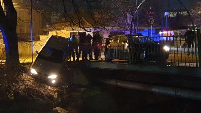 Здрелищна катастрофа доведе до увисването на лек автомобил от моста на "Стара река" в близост до бившата вакумна.
