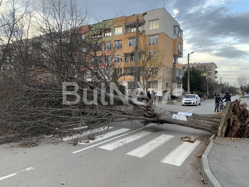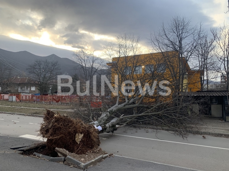 Стихията повали и огромно дърво на ул. „Дико Илиев“ и напълно блокира преминаването по нея. Секунда преди това минала кола и това спасило човека в нея. При падането дървото е скъсало и жиците между съседните стълбове.