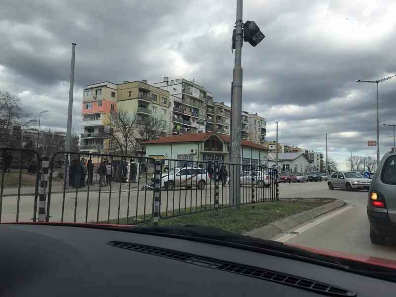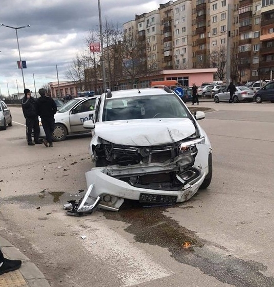 Фирмен лек автомобил „Дачия“ е ударил странично линейка на бул. „Панония“. Сблъсъкът е бил доста силен, тъй като предната част на колата е напълно размазана. И двамата участника в катастрофата все още на насред кръстовището и така ограничават минаването през него.