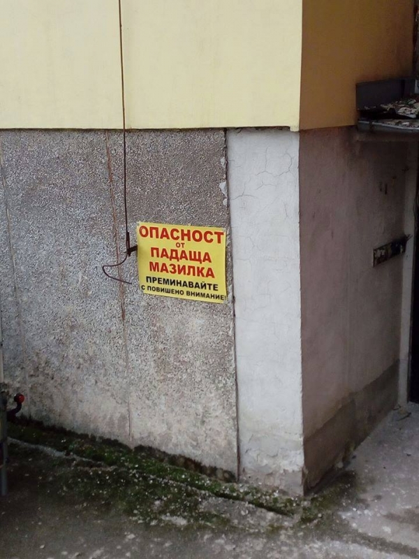Единствената мярка, която са предприели живущите в сградата е поставената табела с надпис: „Опасност от падаща мазилка, преминавайте с повишено внимание!“.