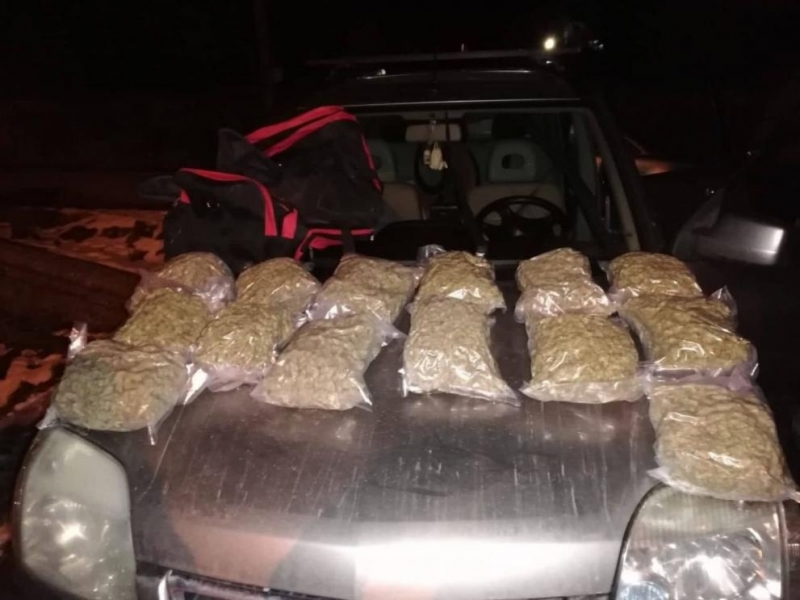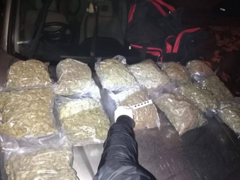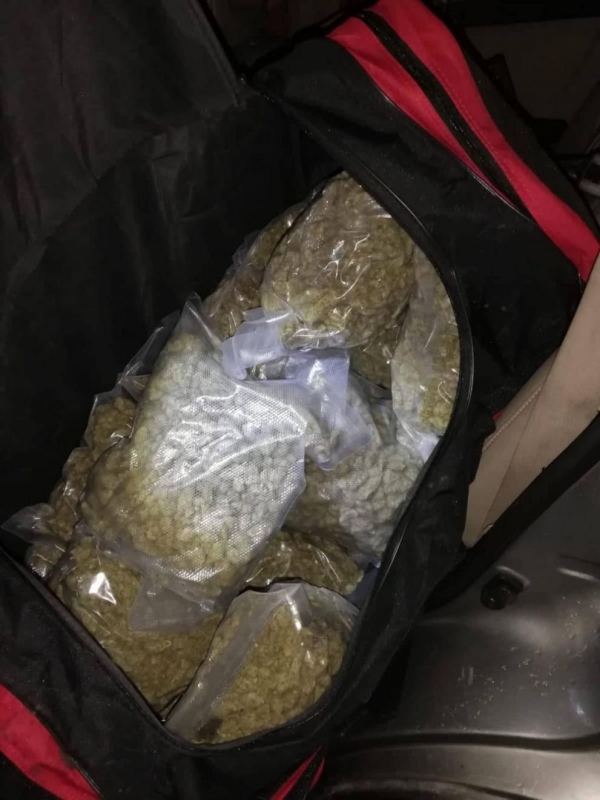 При извършените процесуално-следствени действия, на задната седалка на колата е открит сак, пълен с 14 прозрачни полиетиленови плика със суха зелена листна маса, която при полеви наркотест е реагирала на марихуана, с общо брутно тегло 8.14 кг.