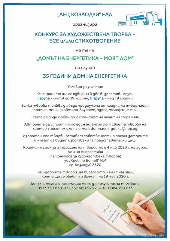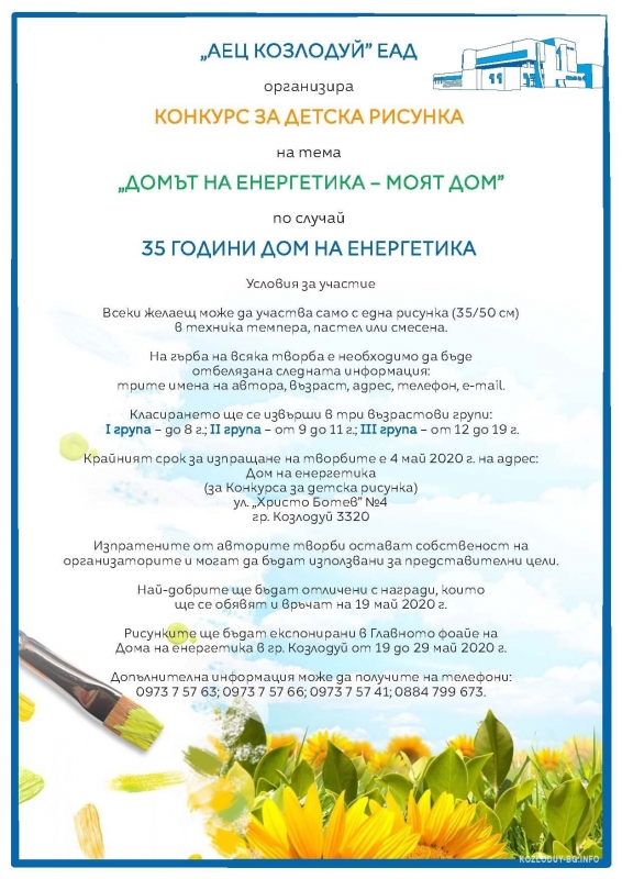 Два конкурса обяви АЕЦ „Козлодуй” по повод 35-годишнината от създаването на Дома на енергетика. Единият е за рисунка, като всеки желаещи може да участват само с една творба.