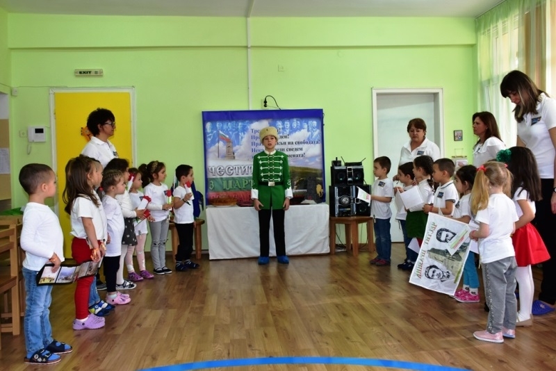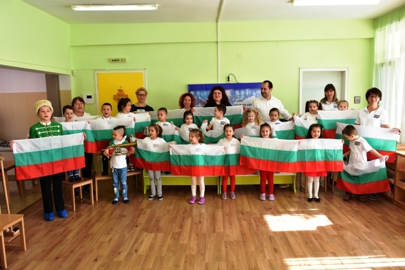 Кметът Каменов подари знамена и на възпитаниците на детска градина „Европейчета“, които взеха участие в урок по родолюбие, представящ паметни дати и моменти от Освобождението.