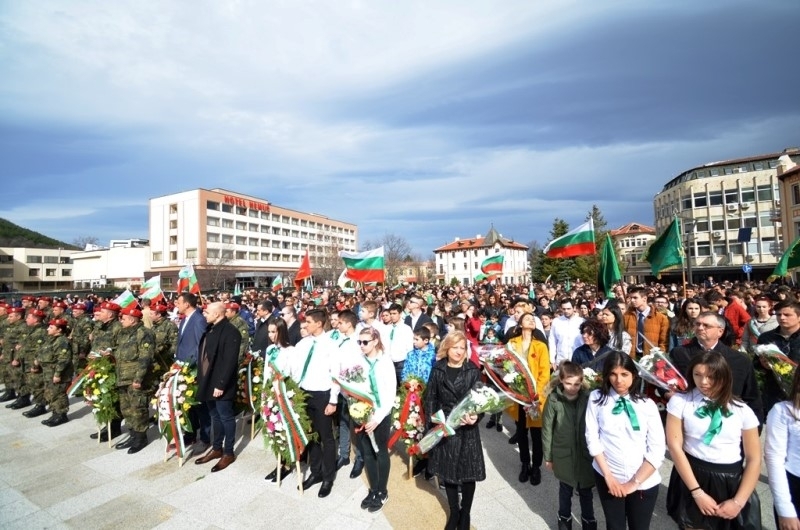 С издигане на българското знаме започна официалната церемония по отбелязване на Националния празник, а възпитаничката на СУ „Христо Ботев“ – Ивайла Каменова и актьорът Цветана Горкиева изпълниха патриотични стихове.