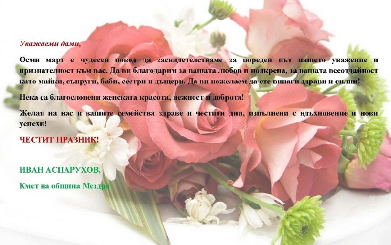 Поздрав от кмета на община Мездра Иван Аспарухов по случай Международния ден на жената - 8 март
