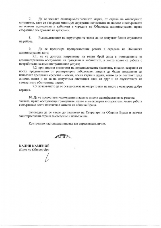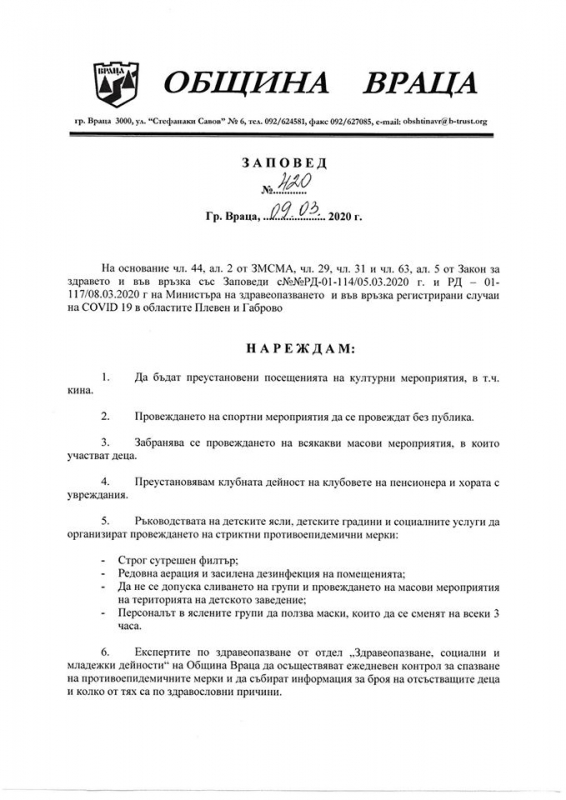 Във връзка с регистрираните случаи на COVID-19 на територията на България и заповед на министъра на здравеопазването Кирил Ананиев, кметът на Община Враца – Калин Каменов издаде заповед, с която се преустановяват посещенията на културни мероприятия, в това число и кина, спортните събития ще се провеждат без публика.