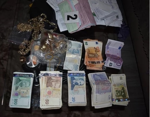 В хода на проведена Специализирана полицейска операция на ОД на МВР-Кърджали, при извършено претърсване и изземване, в жилища и автомобили, ползвани от двамата обвиняеми, са намерени значителна сума пари – около 30 000 лева, договори за прехвърляне на автомобили, документи за преводи на парични суми, тефтери с имена на длъжници, златни накити и др.