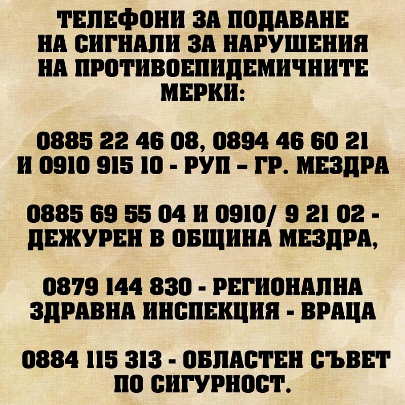 Община Мездра обяви телефони за подаване на сигнали при нарушаване на противоедимични мерки.