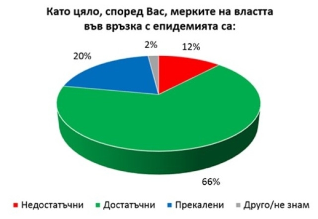 Леко нараства делът на тези, които смятат мерките за прекалени - 20%, и слабо намалява делът на считащите, че мерките са недостатъчни - 12%.