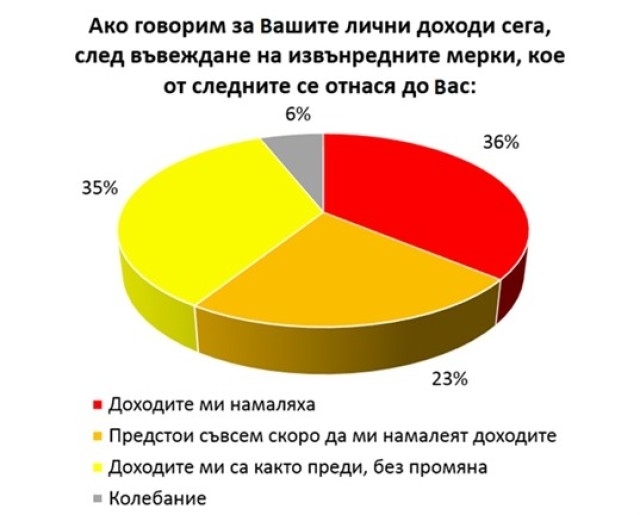Обезпокояващи обаче са числата, описващи икономическото съзнание на населението. 36% декларират, че след въвеждането на извънредно положение доходите им са намалели. 23% са отговорили, че имат чувството, че съвсем скоро предстои доходите им да намалеят, а 35% са заявили, че няма промяна в доходите им.
