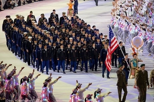 Американски спортисти дефилират при откриването на Седмите военни игри в Ухан на 18 октомври 2019 г.
