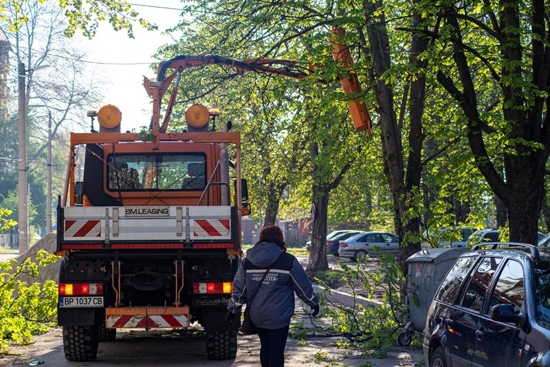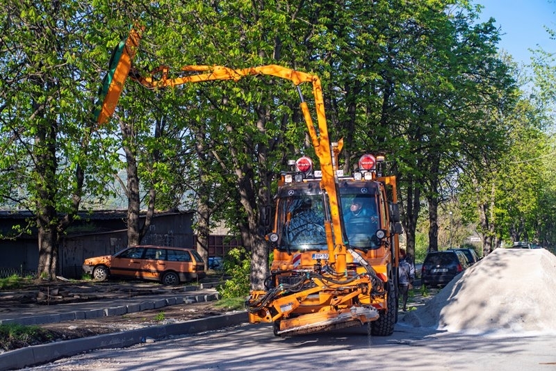 Паралелно се извършва подрязване на клоните на дърветата по градската улична мрежа с многофункционалната машина „Унимог“.