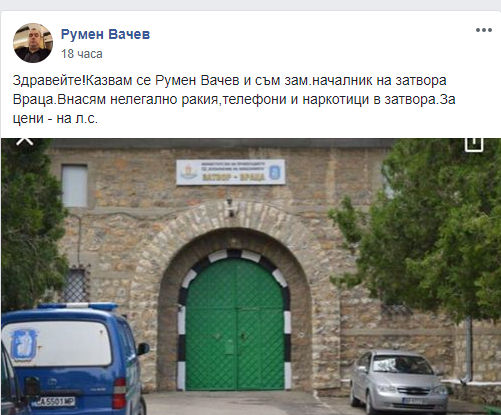 „Здравейте! Казвам се Румен Вачев и съм зам.началник на затвора Враца. Внасям нелегално ракия,телефони и наркотици в затвора.За цени - на л.с.“, гласи текстът на поста във фейсбук.