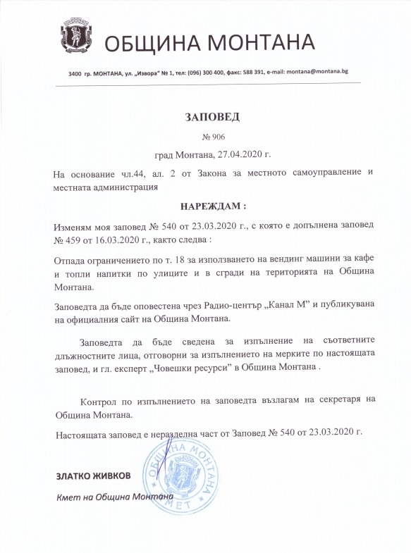 Със заповед на кмета Златко Живков отпада ограничението на използването на вендинг машини по улиците и сградите на територията на община Монтана.