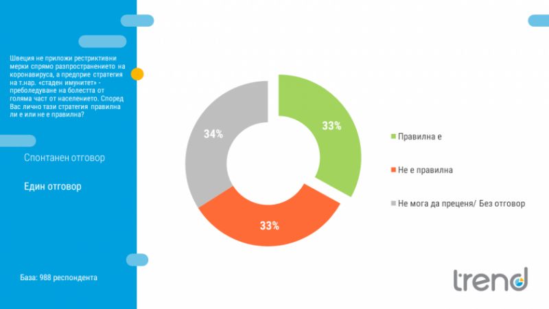 33% посочват, че стратегията на Швеция е правилна. Същият дял (33%) са на противоположното мнение и смятат, че тази стратегия не е правилна. 34% не могат да преценят.