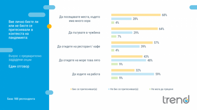 68% от българите биха се притеснявали да посещават места, където има много хора. 28 на сто обаче са на противоположното мнение. 57% от хората не биха отишли на на ресторант или кафе, а 39% от тях не се притесняват, показват данните от последното проучване на „Тренд“ по поръчка на вестник „24 часа“, посветено на ситуацията около COVID-19.
