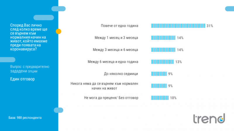 Най-голям дял - 31%, посочват, че ще е необходимо повече от една година, за да се завърнем към нормалния начин на живот, а 9% заявяват, че никога няма да се върнем към него.