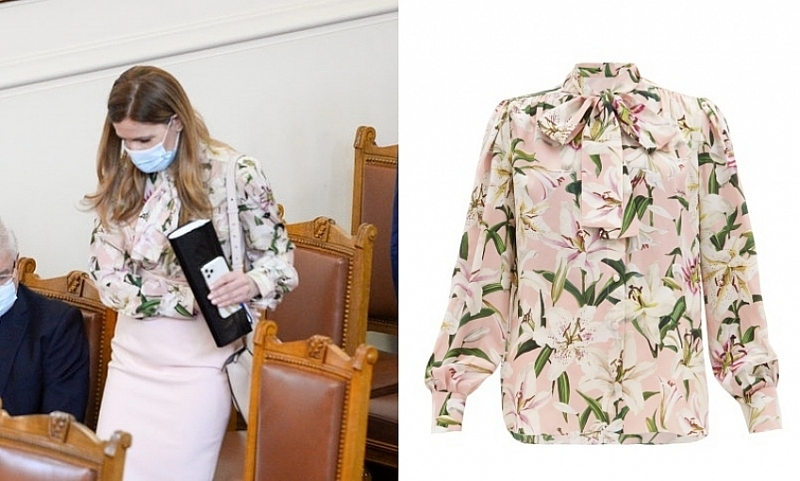 На вчерашното заседание в парламента министърът на туризма Николина Ангелкова носи блуза на известната италианска марка Dolce and Gabbana. Дрехата е от колекция Пролет/Лято 2019. Цената на модела е 1 145 долара, което е приблизително 2 064 лева.