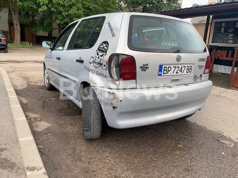 Щетите са основно по задната лява част на „Фолксваген“-а. Има огънати ламарини и счупен стоп.