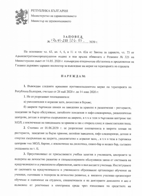 Това е поредна стъпка на правителството по пътя на отхлабването на мерките срещу разпространението на коронавируса у нас. От 1 юни ще бъде разрешено на ресторанти, кафенета и сладкарници да работят и в закрити помещения. Ще се спазват същите мерки за работа, които важаха и до момента за градините.