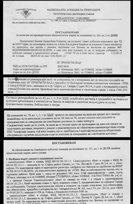 Укриващият се в Дубай Васил Божков публикува в сряда сутринта постановлението, с което е запорирана сградата на Телефонната палата в София. Той твърди, че възбраната е наложена заради невнесен ДДС "от евентуалните бъдещи приходи от продажба на билети от все още несъществуващия и вече запориран музей".