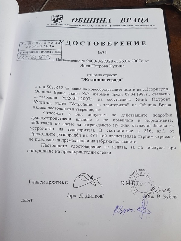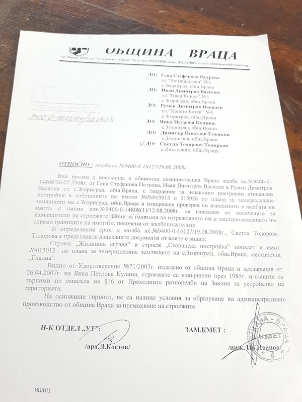 Строежът на сградата е законен, но сегашните собственици се опитват да я бутнат, разказва мъжът. През 2008 година е извършена проверка от Община Враца, която установява, че строежът, извършен от семейството през 1985 година, е легитимен и търпим по смисъла на разпоредбите на Закона за устройството на територията. На основание на това, не са налице условия за образуване на административно производство от Община Враца за премахването му.