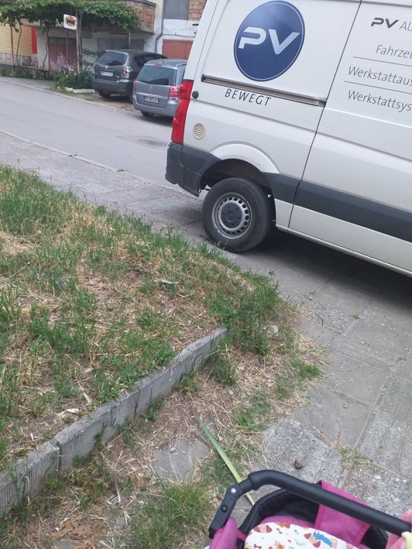 Фирмен бус е окупирал тротоар на улица в населеното място, като е направил невъзможно преминаването на майка с малко бебе в количка. Кадрите са публикувани в социалните мрежи от възмутената жена.