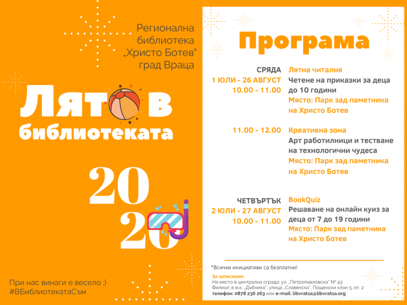 С лятна читалня на открито стартира „Лято в библиотеката 2020”. Програмата е организирана от Регионална библиотека „Христо Ботев” – Враца, а началото ще бъде дадено на 1 юли /сряда/ от 10 часа, в парка зад паметника на Христо Ботев в града.
