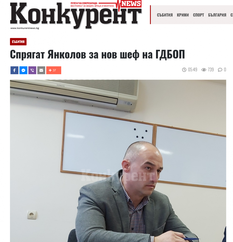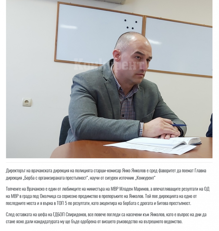 Днес сутринта обаче врачанският седмичник „Конкурент“ гръмна с новината, че директорът на областната дирекция на МВР във Враца Янко Янколов е фаворит за мястото на подалия оставка Ивайло Спиридонов. От фалиралия всекидневник бяха стигнали дотам да твърдят, че той е любимец на вътрешния министър Младен Маринов, което пък било сигурна гаранция, че именно Янколов ще оглави ГДБОП. По техни думи „всички погледи били насочени към Янколов, като е въпрос на дни да стане ясно дали кандидатурата му ще бъде одобрена от висшето ръководство на вътрешното ведомство“. Чистокръвни мисирки!