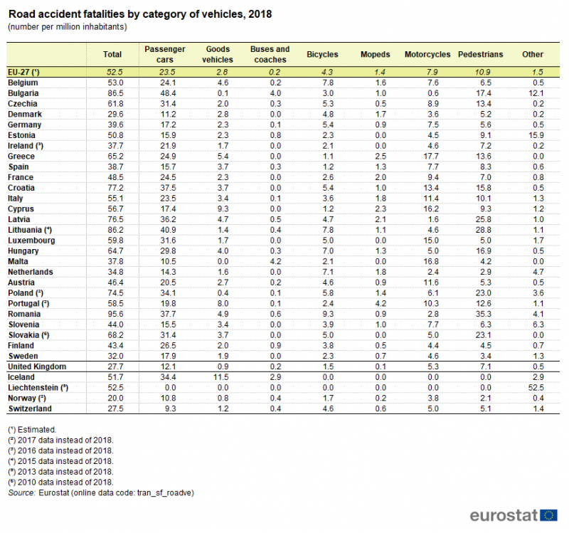 През 2018 г. 23 339 души са загинали в пътно-транспортни произшествия в ЕС. От жертвите на пътя 45% са пътували с леки коли, 21 на сто са пешеходци, 15% - мотоциклетисти, 8 на сто колоездачи и 12% са включени в други категории (камиони, микробуси, автобуси и др.)