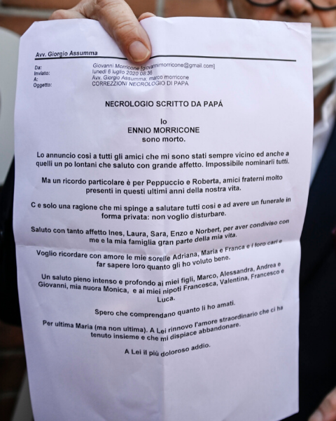 Маестро Енио Мориконе, който почина на 91 години, е написал писмо, адресирано до съпругата му, в което се прощава с нея. Това съобщава изданието ”Куриере дела Сера”, коет утре ще публикува писмото.