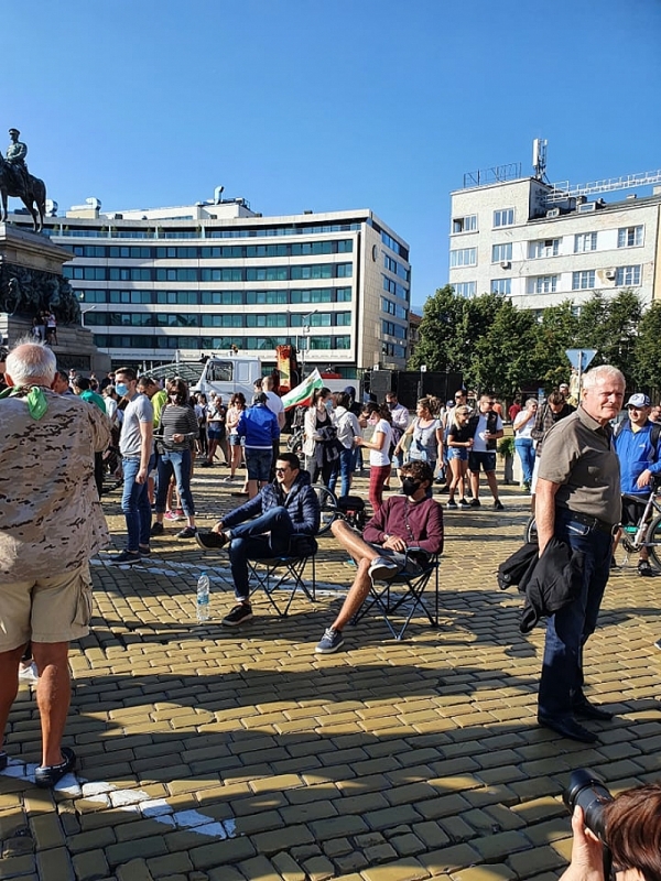 Първоначално хората започнаха да правят опити да спрат движението по жълтите павета, като тръгнаха непрекъснато да пресичат пешеходната пътека. Все пак колите намираха начин да минат, но само до едно време. Пространството около паметника продължава и в този момент да се запълва с все повече хора. Първите автобуси, които докараха част от депутатите, които бяха силно освиркани. Чу се първия звънец. в пленарната зала. В същото време протестиращите са все по-близо до парламента. Движението вече е блокирано за автомобили. Вотът на недоверие е темата корупция. Дебатите в НС ще са само днес, а утре ще бъде гласуването на вота на недоверие. Служебният вход е със засилена охрана, така че и пиле не може да прехвръкне. Периметърът е блокиран с полиция и жандармерия. "С действията си показваме, че нямаме намерение да си тръгнем", "Взели сме си книги. Ще четем, докато цялото правителство не си тръгне", казаха хората.