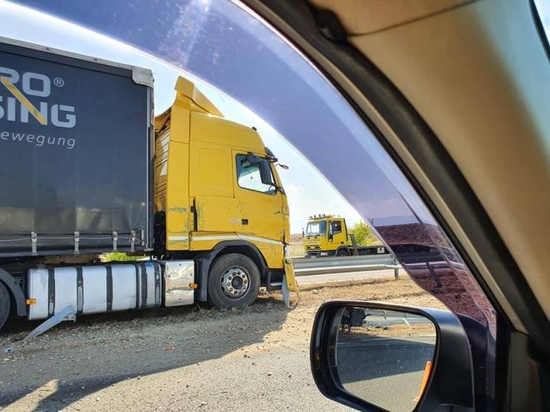 По първоначални данни са се блъснали два товарни автомобила, като причината е, че единия е спукал гума, а другият по същото време го изпреварвал. Хубавата новина е, че няма пострадали хора, нанесени са само материални щети по автомобилите. На мястото са изпратени два автопатрула на Пътна полиция при ОДМВР-Пазарджик, има и екип на Автомагистрали АД с указателна светеща табела. Движението не е спряно, осъществява се в основната и аварийната лента.