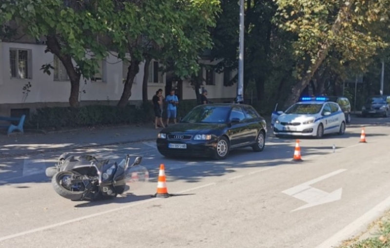 Катастрофата е на кръговото кръстовище на бл. "Кокиче". Сблъскали са се лек автомобил "Фиат" и моторист, като по първоначална информация водачът на колата е причинил произшествието.