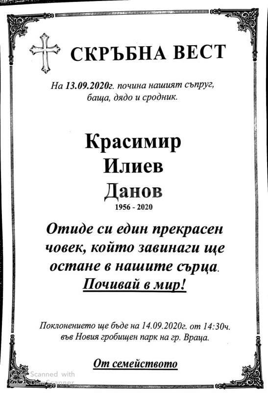 Поклонението ще е на 14 септември от 14.30 часа в Новия гробищен парк на Враца.