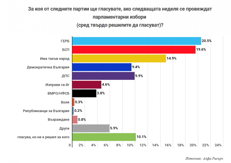 Позициите на ГЕРБ и БСП са равни, като управляващата и водещата опозиционна сила взимат около 20 на сто от гласовете на твърдо решилите да гласуват. В предишното проучване на "Алфа Рисърч" - от юли, партията на премиера Бойко Борисов взимаше 26.7% срещу 19.2 за левицата. Сега ГЕРБ продължава да има преднина от 0.9 на сто, а според социолозите парадоксалното на пръв поглед удържане на позицията на партията се дължи на два основни фактора: ре-мобилизацията на твърдото ядро и слабо преминаване на нейни избиратели към конкурентни партии вдясно.