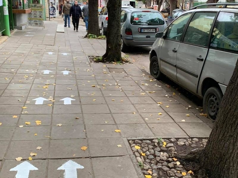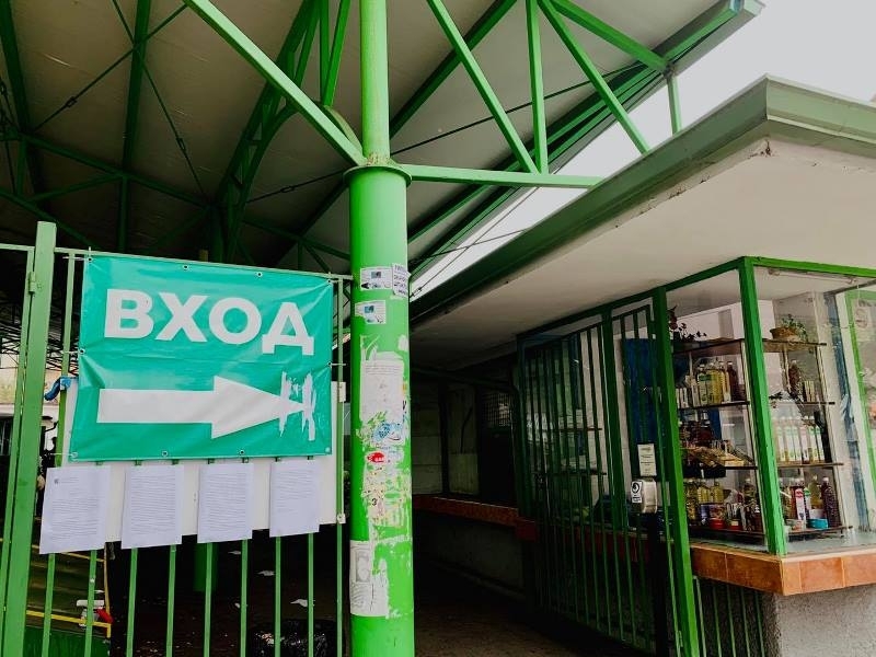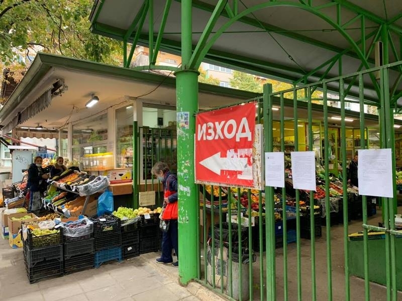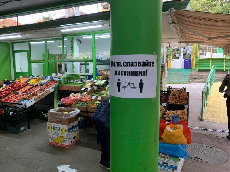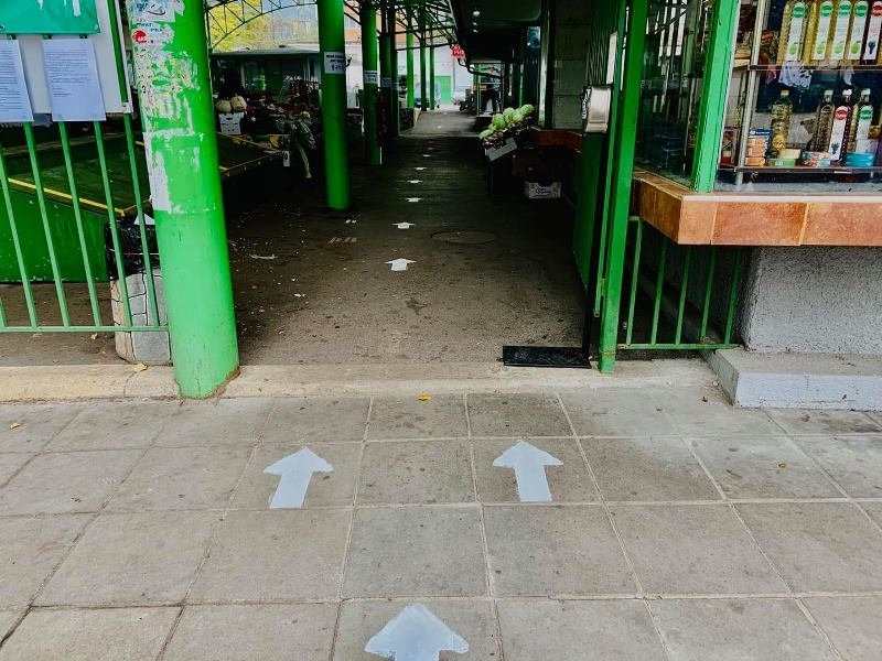 Поставени са указателни табели, обозначаващи Вход/Изход, както и стрелки за посоката на движение. На входа на пазара е монтиран мобилен диспенсър за дезинфекция на посетителите.
