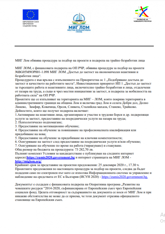 МИГ ЛОМ, с финансовата подкрепа на ОП РЧР, обявява процедура за подбор на проекти №BG05M9OP001-1.098 МИГ ЛОМ „Достъп до заетост на икономически неактивни и безработни лица“.
