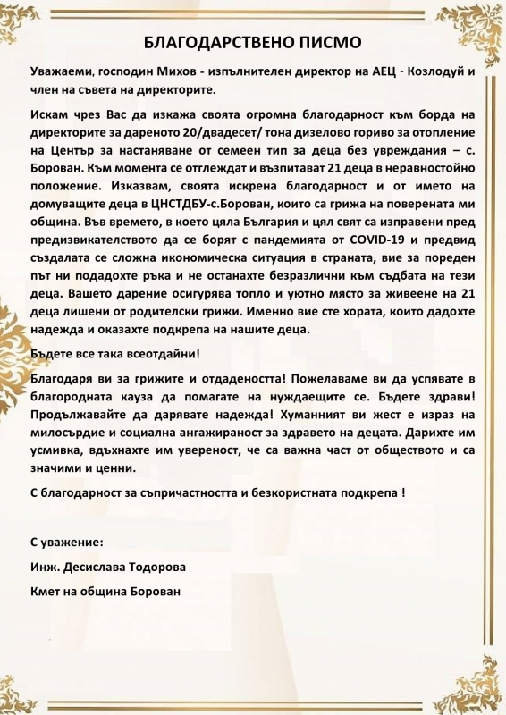 Искам чрез Вас да изкажа своята огромна благодарност към борда на директорите за дареното 20 /двадесет/ тона дизелово гориво за отопление на Център за настаняване от семеен тип за деца без увреждания – Борован.