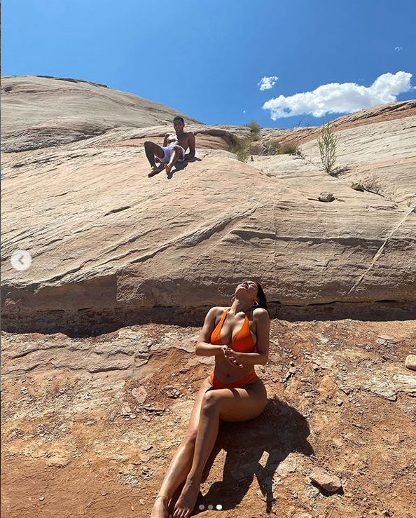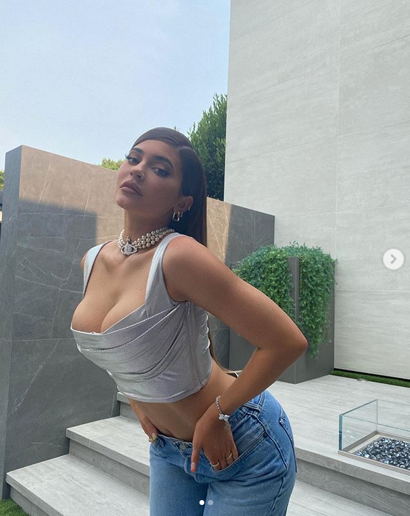 Кайли гледа съблазнително към камерата, докато парадираше с перфектните си крака, притискайки ръка върху гърдите си.