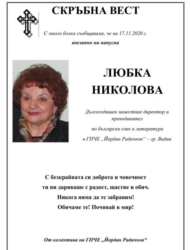 Дългогодишният заместник директор на ГПЧЕ „Йордан Радичков“ във Видин Любка Николова е починала вчера, научи агенция BulNews.