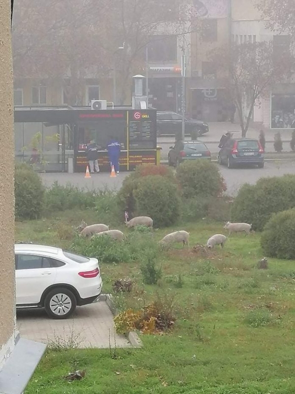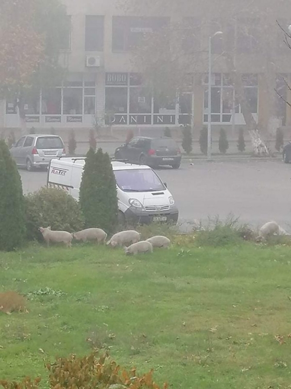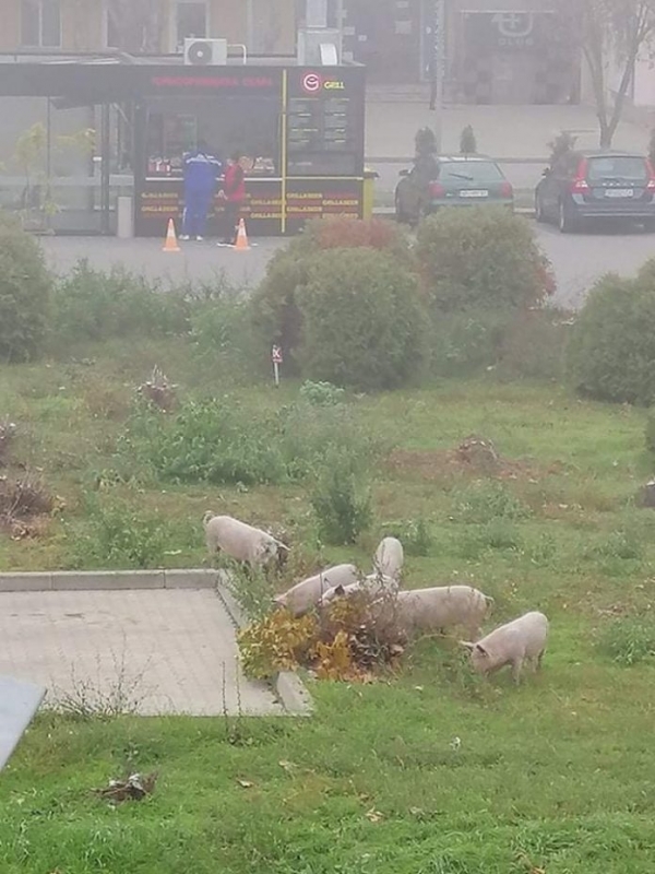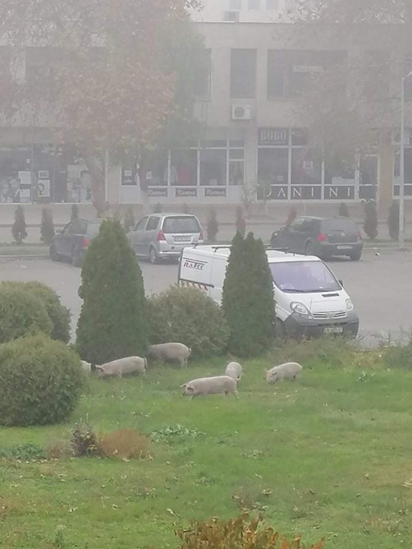 Около обяд, в района на един от големите хипермаркети в Козлодуй, жители на града са забелязали необичайното шествие на 6 прасета.