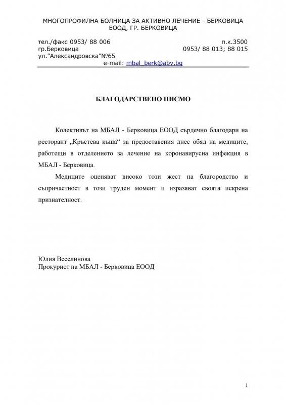 От МБАЛ-Берковица излязоха с благодарствено писмо към собствениците на ресторант "Кръстева къща", видя агенция BulNews.