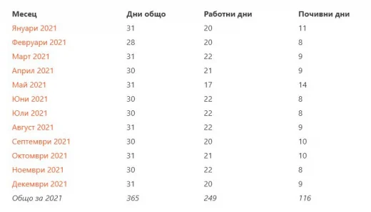 2021 г. не е високосна. От 365-те дни 250 са работни, 104 са уикенд и още 12 са официални празници. Официалните празници са всъщност 16 дни, но 4 от тях се падат събота или неделя и в подобни случаи почиваме първите дни от идната работна седмица.