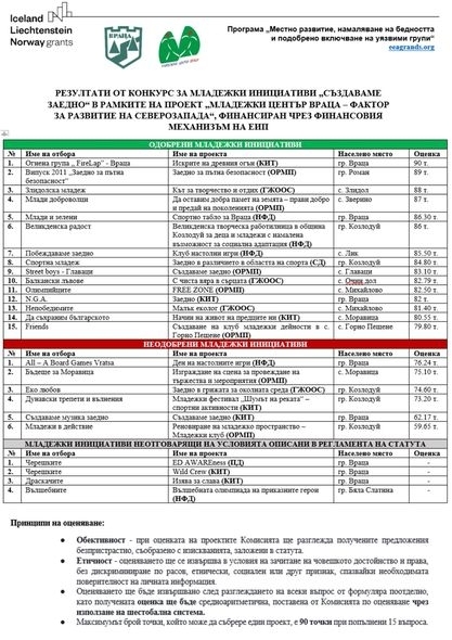 Останалите младежки инициативи, които получиха одобрение, са „Искрите на древния огън“ на „Огнена група „FireLab“ - Враца, „Заедно за пътна безопасност“ на “Випуск 2011 „Заедно за пътна безопасност“ - гр. Роман, „Спортно табло за Враца“ на „Млади и зелени“ - Враца, „Великденска творческа работилница в община Козлодуй за деца и младежи с намалена възможност за социална адаптация“ на „Великденска радост“ - Козлодуй, „Заедно в различието в областта на спорта“ на „Спортна младеж“ - Козлодуй, „Създаваме заедно“ на „Street boys” - с. Главаци, „Free zone” на „Олимпийците“ - с. Михайлово, „Заедно“ на „N.G.A” - гр. Враца, „Малък еколог“ на „Непобедимите“ - с. Михайлово и „Създаване на клуб младежки дейности в с. Горно Пещене“ нa “Friends“ - с. Горна Пещене.