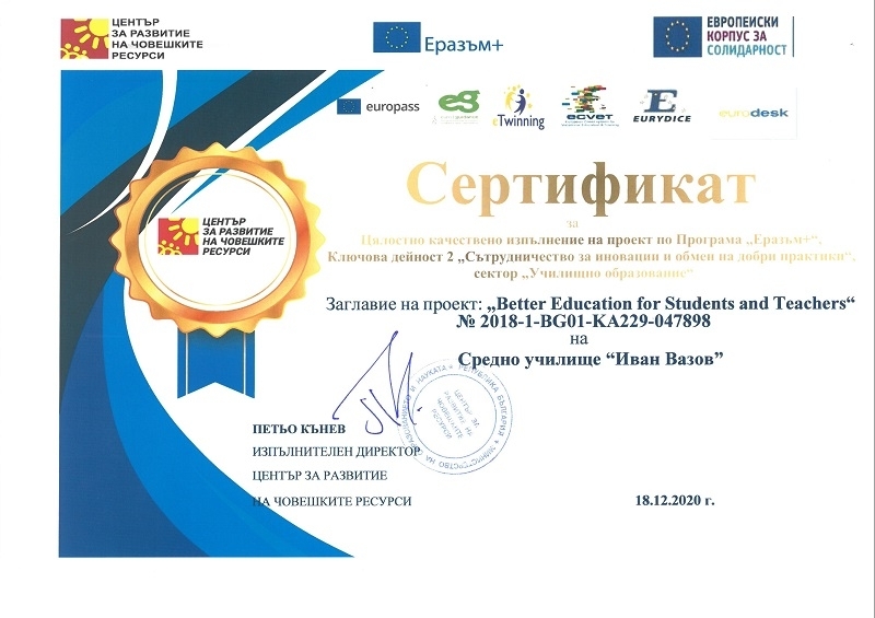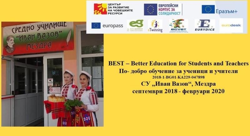 Проектът на Средно училище „Иван Вазов“ в Мездра „BEST - Better Education for Students and Teachers” („По-добро обучение за ученици и учители”), реализиран по Програма „Еразъм+“ 2014-2020 г. в партньорство със сродни учебни заведения от Хърватска, Полша, Румъния, и Турция, беше награден от Центъра за развитие на човешките ресурси (ЦРЧР), в ролята му на Национална агенция по Програма „Еразъм+“ на Европейската комисия, със сертификат за цялостно качествено изпълнение на проекта в Ключова дейност 2 „Сътрудничество за иновации и обмен на добри практики“, сектор „Училищно образование“.